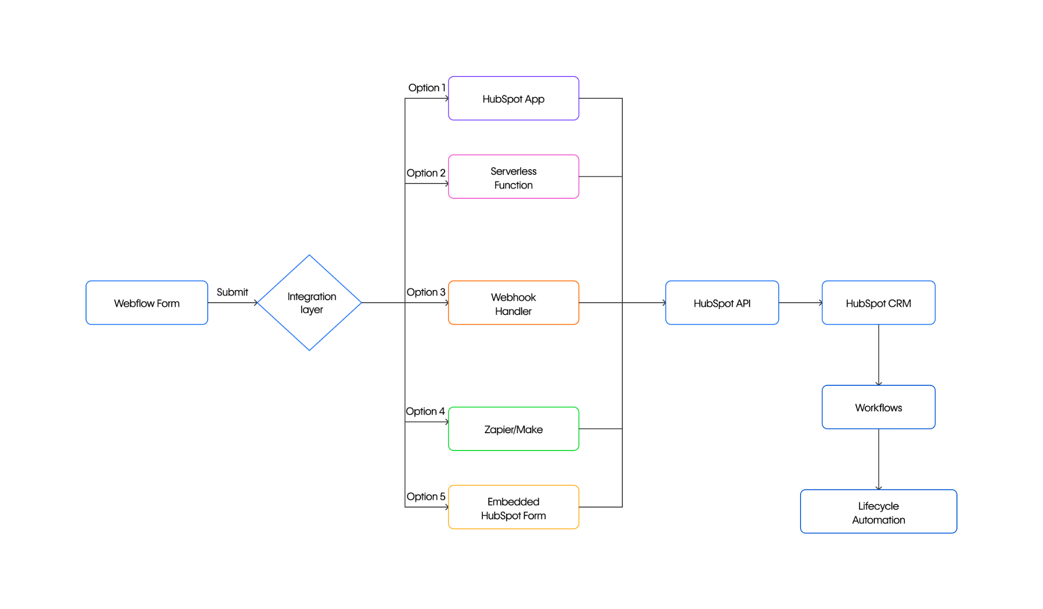 Route Webflow form submissions to HubSpot CRM with serverless functions, webhooks, or middleware platforms.