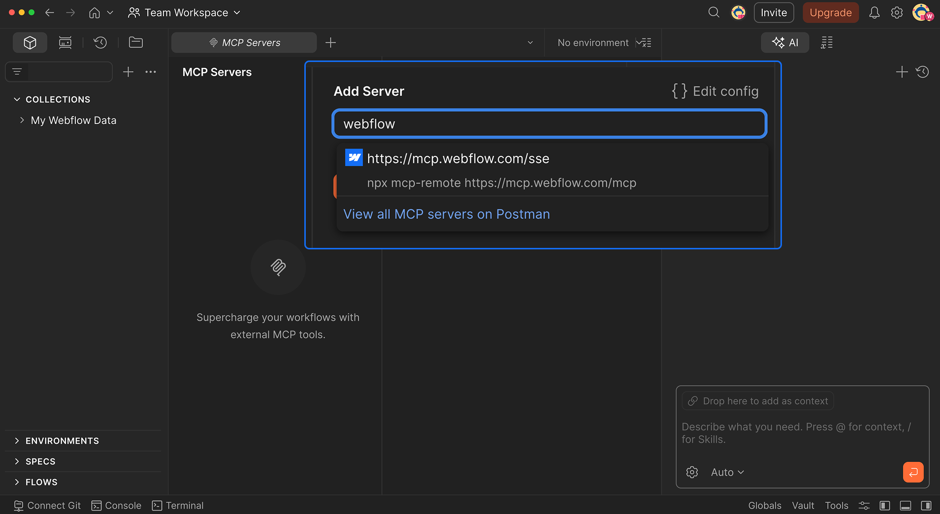 Add the Webflow MCP server by searching for "Webflow". Click "Add Server" once you found it. Postman will start communicating with the Webflow MCP endpoint via https://mcp.webflow.com/mcp.