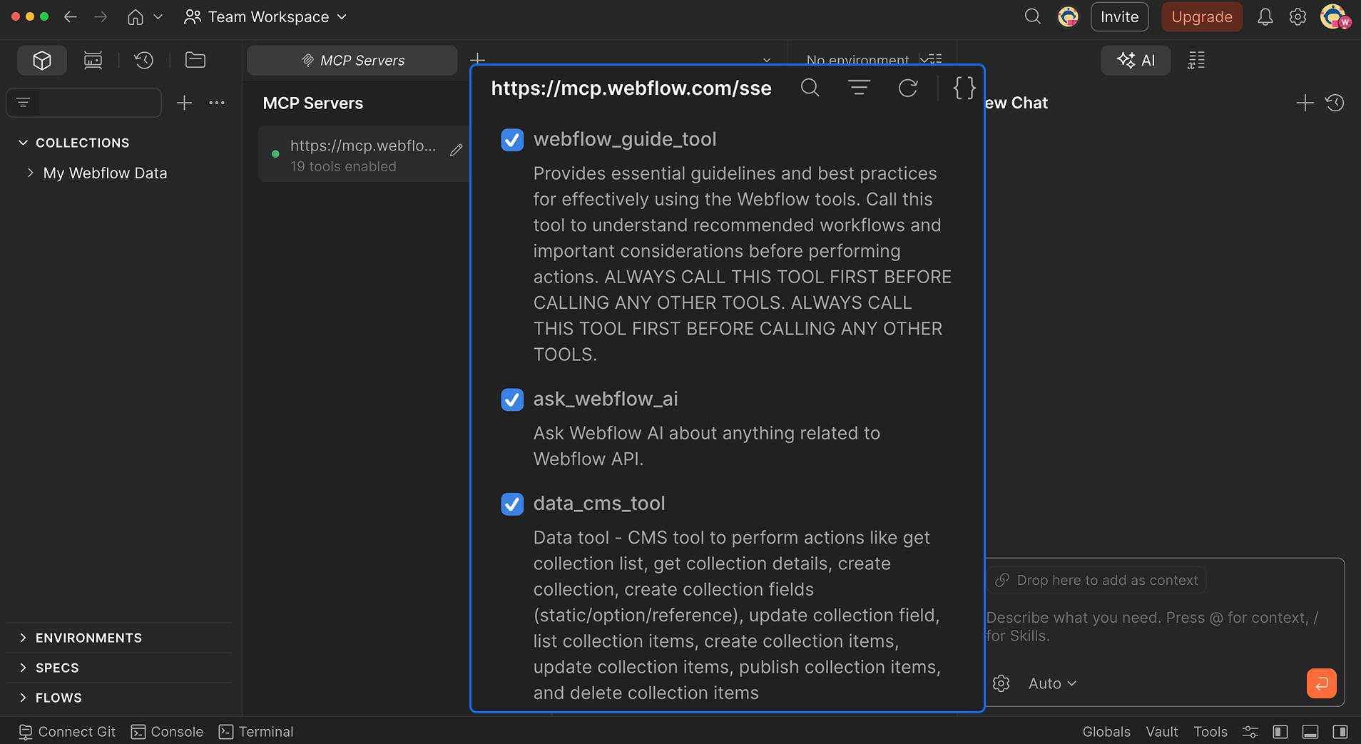 The Webflow MCP server (MCP is a standard that lets AI agents discover and call APIs) exposes the full Webflow API as tools that Postman's agent can use. This combination enables developers to use AI to build, test, and manage the Webflow APIs from a single place.