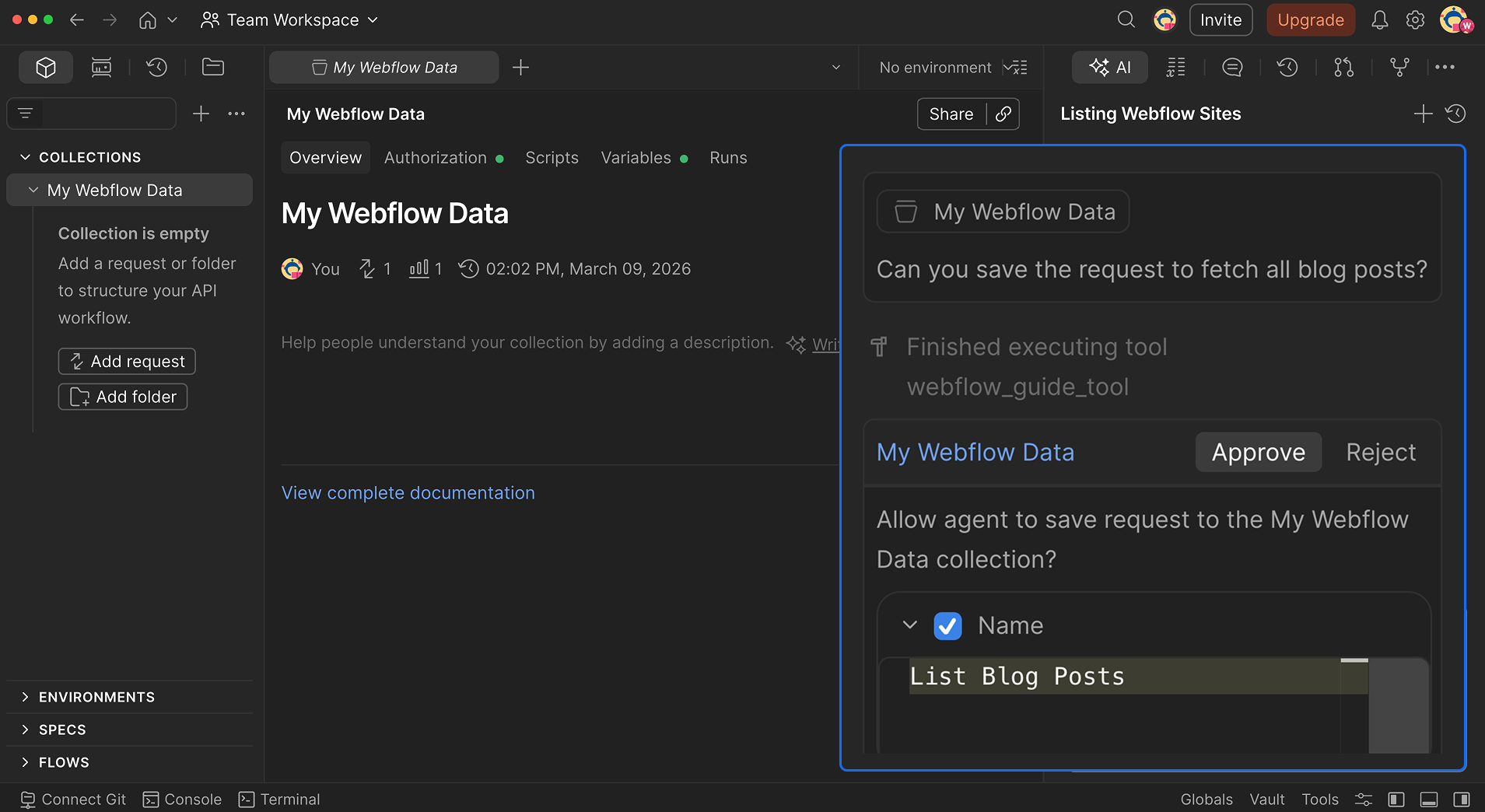 Open Postman, add the Webflow MCP server, and try asking for your site list, blog posts, or any data you're interested in. You'll have a working request collection before you finish your coffee.